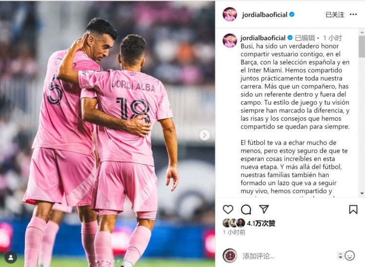 在即將結束的賽季裏,布斯克茨將正式告別他的職業生涯,隊友阿爾巴在社交媒體上對他表達了深情的敬意。阿爾巴分享了一張與布斯克茨的合影,字裏行間透露出對這位傳奇球員的無盡懷念。他寫道:“布斯克茨,能與你一同在巴薩、西班牙國家隊以及邁阿密國際共度更衣室時光,我感到無比榮幸,我們幾乎整個職業生涯都是並肩作戰的戰友。你不僅是我的隊友,更是我在場上場下的榜樣。