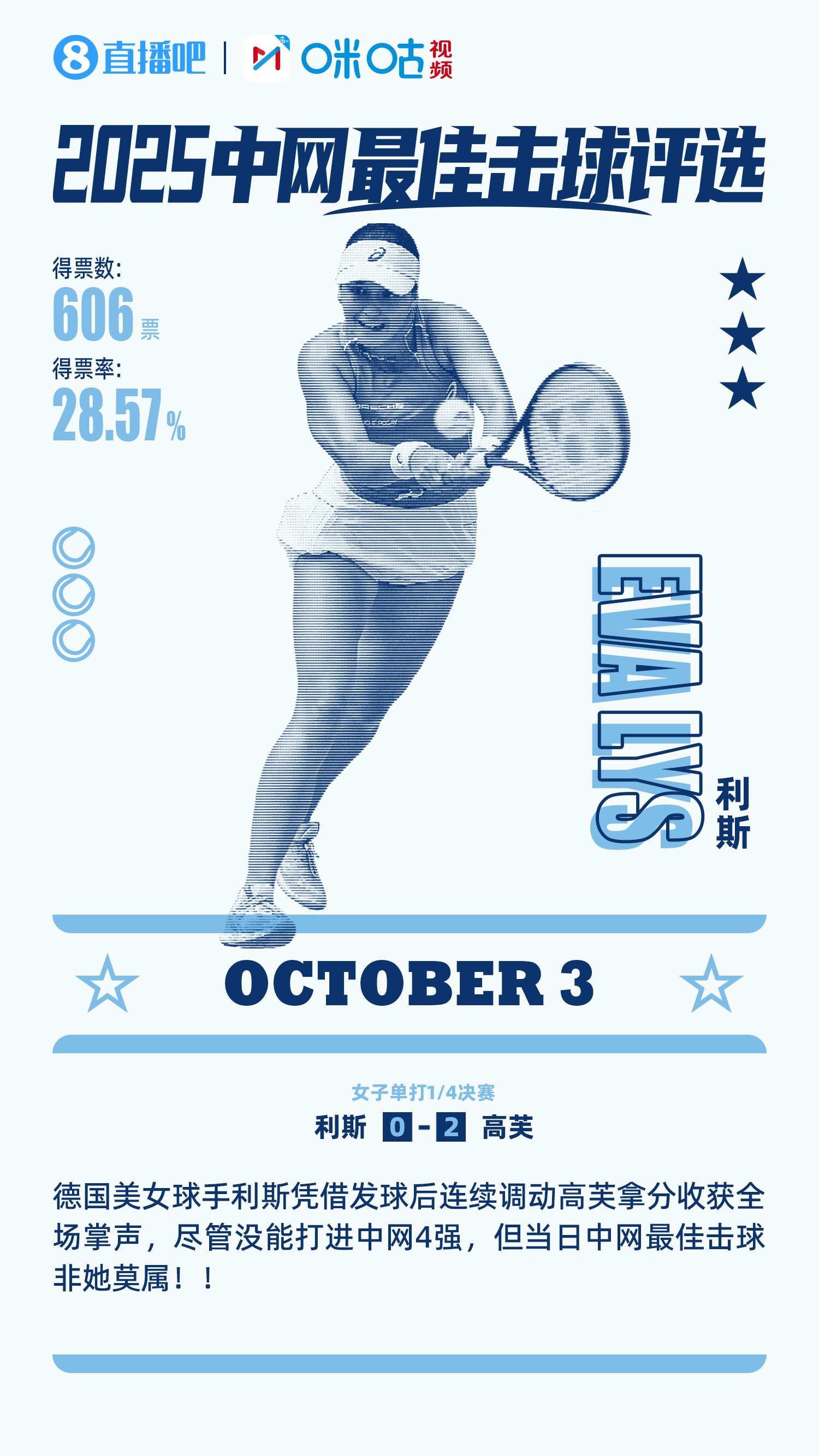 在10月3日的投票中,利斯以她那精巧的發球和隨後的調動手法,牢牢把握住了比賽的主動權,並成功拿下了28.57%的吧友投票,榮耀地成為了當日的#中網最佳擊球#。這不僅是個人努力的體現,也是對她卓越技巧的褒獎。