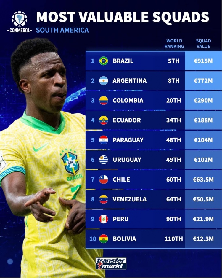 南美國家隊身價排名:巴西以9.15億歐元位列第一,阿根廷7.72億歐元緊隨其後